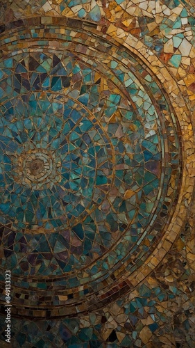 Circular mosaic pattern reveals intricate designs in shades of blue, brown. Numerous small, irregularly shaped tiles fitted together to form concentric circles around central point.