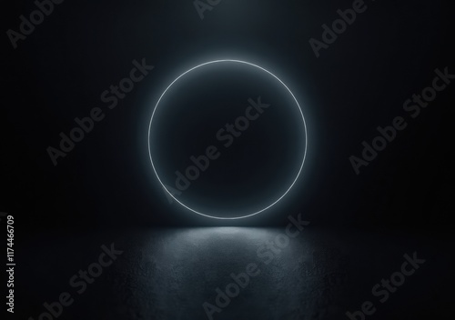 Circular neon light installation glowing against a dark backdrop in a modern space