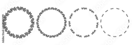 Circular sound waves. Abstract circular lines pattern. Music audio bursts. Ring of thin rays with wavy silhouette. Radial spectrum design. Geometric waveform vector illustration
