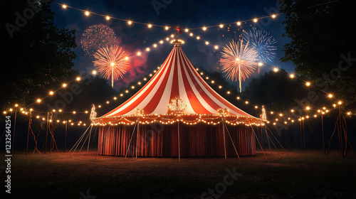 Circus christmas tent, with the lights strung across the top of the canopy around at night time and colorful firework on background