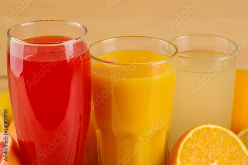 Citrus juices. orange, lemon and grapefruit juice with fresh fruits on a natural wooden background.