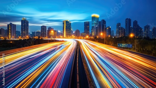 City highway at night with vibrant light trails