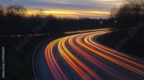 City highway at night with vibrant light trails and illuminated buildings creating an urban landscape
