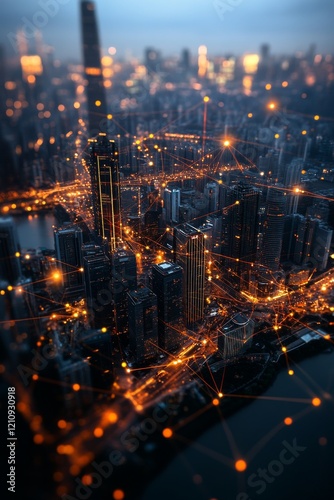 City skyline at dusk with illuminated buildings and network lines connecting the urban landscape
