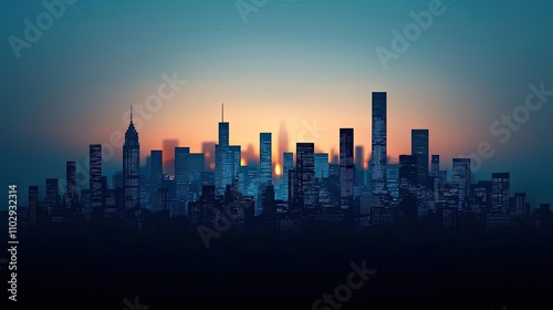 City skyline at dusk with vibrant sunset colors, silhouetted buildings and urban scenery.