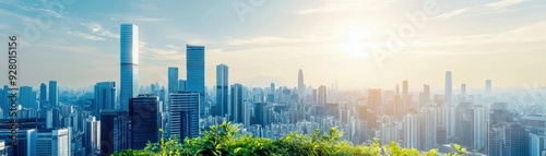 City skyline featuring sustainable buildings with green rooftops, urban living concept, plenty of copy space