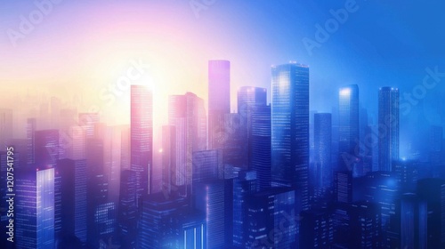 City skyline illuminated by dawn light with vibrant colors and a misty atmosphere