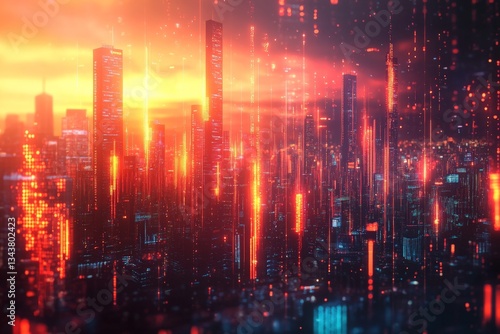 City skyline illuminated by vibrant sunset and digital elements showcasing modern architecture