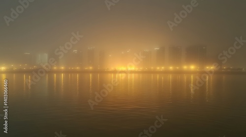 City skyline obscured by dense fog across reflecting water at night
