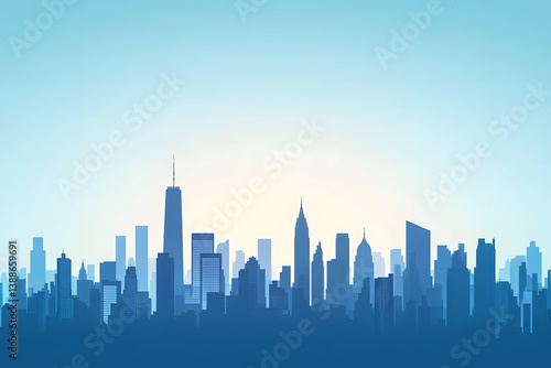 City skyline silhouette with skyscrapers in blue tones against a bright sky.