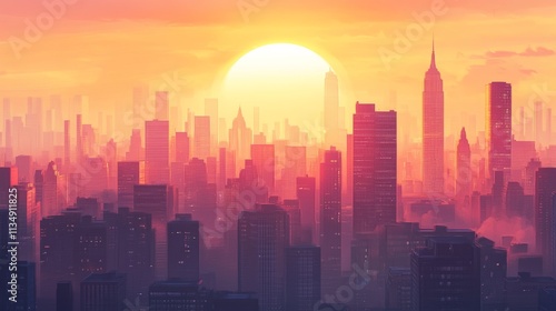 City skyline sunrise views, sun rising behind a metropolitan skyline, casting a warm glow over skyscrapers and cityscape