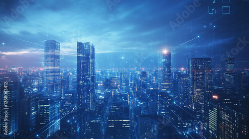 City skyline with digital blue lights and futuristic elements representing the concept of technology, innovation, and smart cities in the modern digital era.