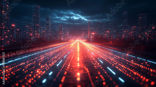cityscape at night, featuring glowing neon lights, towering skyscrapers, and futuristic architecture. The scene captures an urban landscape with a dynamic, tech-inspired atmosphere