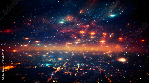 Cityscape at night illuminated with lights creating a stunning aesthetic view in the context of an astronomic chart showing projected areas.