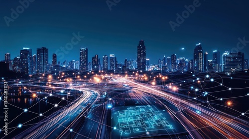 Cityscape at night with interconnected network. Possible use Stock photo for technology, future, or urban design