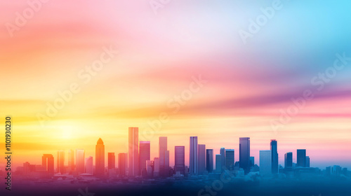 Cityscape background vibrant city skyline at sunset, showcasing skyscrapers silhouetted against colorful sky. warm hues of orange, pink, and blue create serene atmosphere