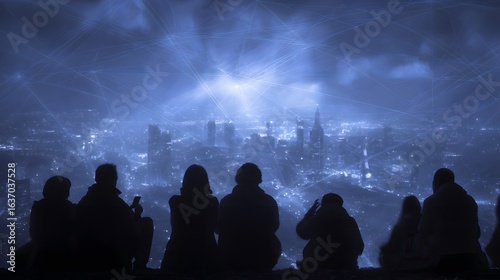 Cityscape panorama viewed from a high vantage point, with people observing.