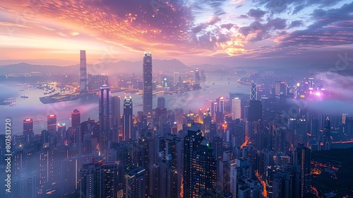 cityscape skylines at twilight in the evening, featuring a towering skyscraper, a bustling street, and a serene river flowing through the center