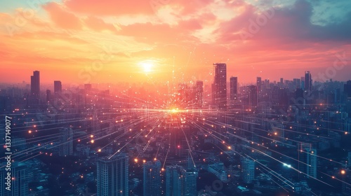 Cityscape sunset network connection. Aerial view of urban infrastructure. Stock photo