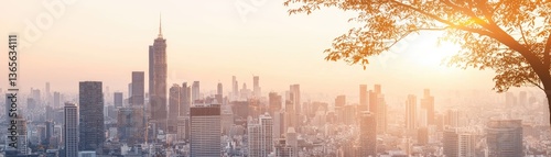 Cityscape sunset, tree branches, urban skyline, hazy light. Website banner