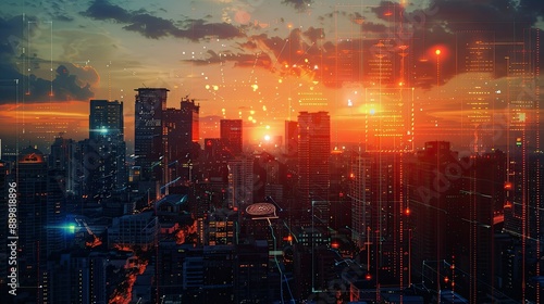 Cityscape with holographic fingerprint and digital overlays at twilight, emphasizing cybersecurity in modern urban settings