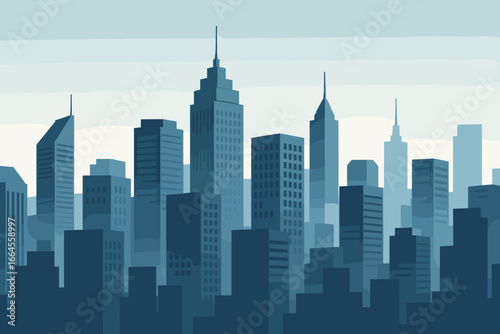 Cityscape with silhouettes of tall skyscrapers and office buildings. Panoramic urban landscape of the metropolis. Silhouettes of a modern city. Modern flat vector background.