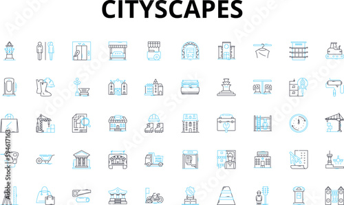 Cityscapes linear icons set. Vibrant, Skyscrapers, Urban, Skyline, Crowded, Traffic, Energy vector symbols and line concept signs. Diversity,Culture,Nightlife illustration