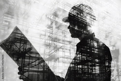 Civil engineer, architectural plans, project management, focus on, bright shades, double exposure silhouette with blueprints