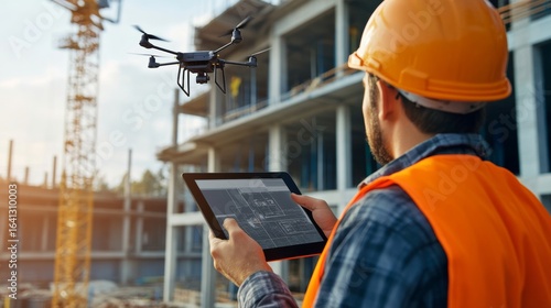 civil engineer using tablet on site, drone flying nearby for site mapping, digital twin interface