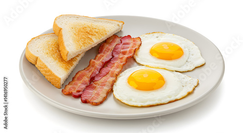 Classic American Breakfast Plate Featuring Fried Eggs Bacon and Toast Isolated on White