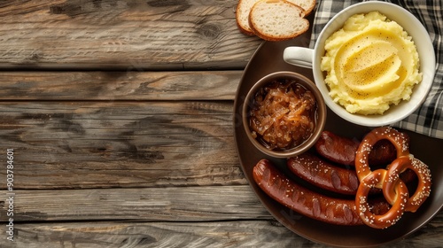 Classic Bavarian Sausages with Pretzels, Mashed Potatoes, and Sauerkraut on Rustic Wooden Table
