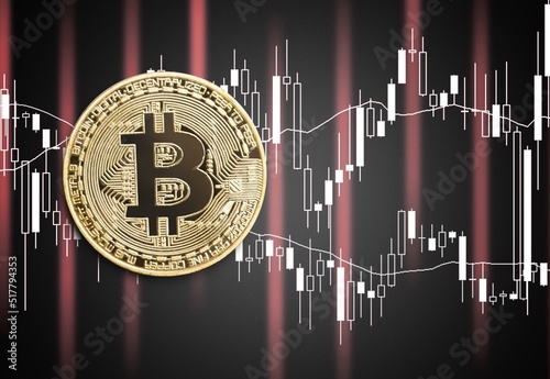 Classic Bitcoin cryptocurrency with candle stick graph chart and digital background.