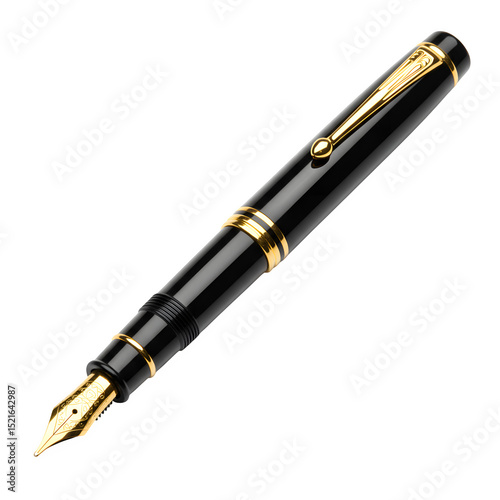 Classic black fountain pen positioned diagonally with visible gold nib and detailing, isolated on white or transparent background. PNG