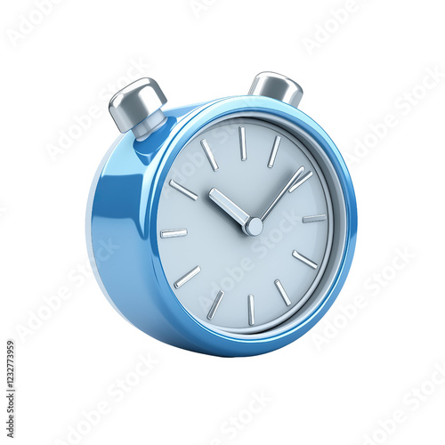 Classic blue alarm clock with two bells and metal frame, isolated on white or transparent background.