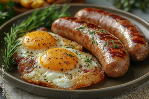 Classic Breakfast: Sausages and Fried Eggs Plated Savory goodness ready to start the day right!