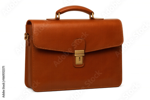 Classic brown leather briefcase with golden details, isolated on transparent background, perfect for business and professional settings