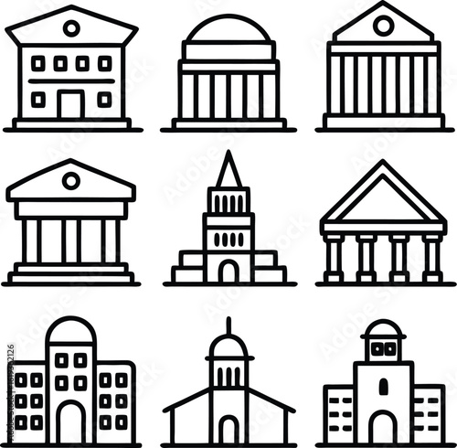 Classic Building Icons: Nine Line Art Architectural Illustrations, Simple Style, Modern Design.