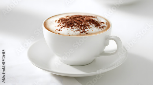 Classic cappuccino in a white porcelain cup with cocoa dusting, set against a soft, bright background