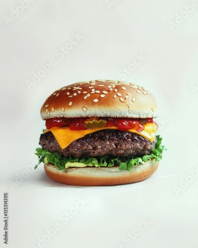 Classic cheeseburger with toppings. A juicy burger on a bun, topped with melted cheese, ketchup, pickles, and lettuce, sitting on a plain background
