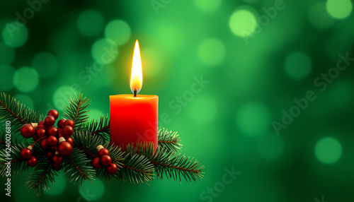 classic christmas decoration with burning red candle on shiny blurred green background, greeting card for holiday season in december, one line art. isolated with white shades