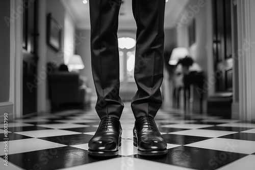 Classic Elegance: A sharply dressed individual stands confidently in a sleek tailored suit, exuding timeless sophistication. Their crisp white shirt and perfectly knotted tie are c