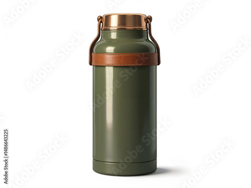 Classic green thermos with handle and leather detail, isolated for travel or camping concept. Generative AI