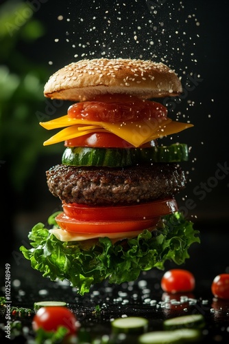 Classic hamburger components in mid-air: lettuce, tomato, cheese, beef patty, sesame bun, set against a dark background