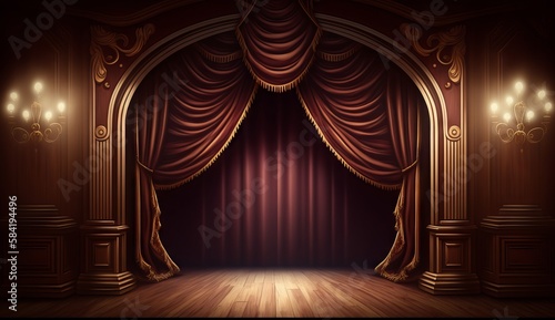 classic maroon curtains with light descended onto the center of the stage. Generative ai