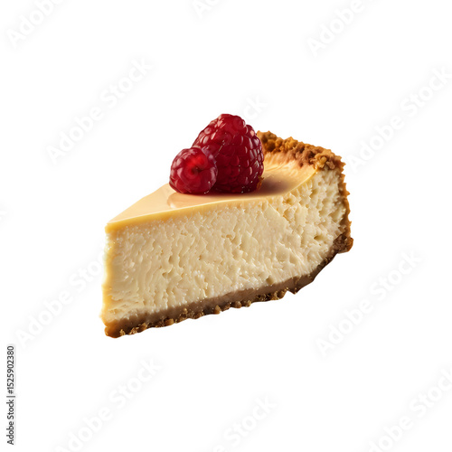 Classic New York Style Cheesecake Slice with Raspberries and Caramel Drizzle