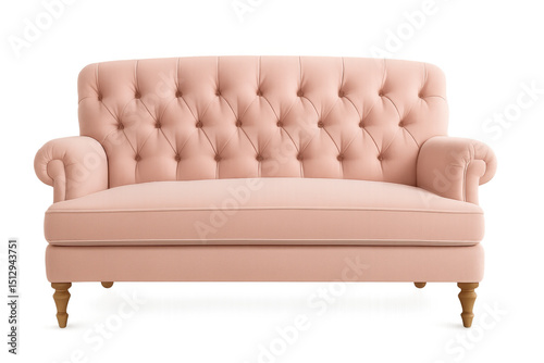Classic pink sofa featuring a tufted backrest, scroll arms, and elegant wooden legs, perfect for interior design projects