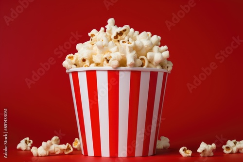 classic red and white striped popcorn bucket spills over with kernels on a matching red background