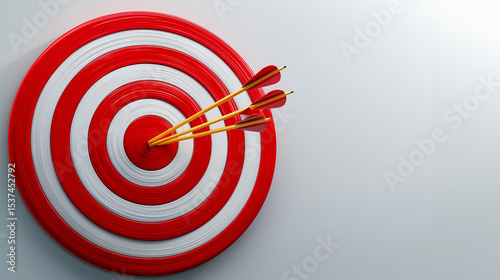Classic red and white target with three arrows hitting the bullseye symbolizing precision, focus, accuracy and achievement. Business goals, successful strategy, leadership and personal growth.