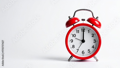 Classic red twin-bell alarm clock showing 12:00 with white face and black numerals on plain white background