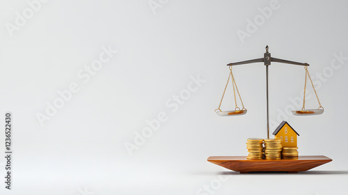 classic scale balancing model house and coins symbolizes financial stability and investment. This conveys importance of weighing assets in real estate